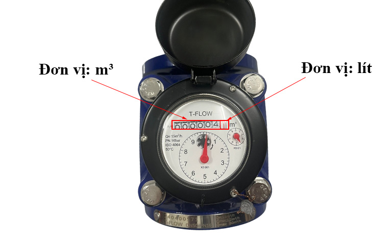 Ví dụ: Trên mặt đồng hồ biểu thị dãy số 000123 màu đen và màu đỏ là số 4 có nghĩa lưu lượng nước đọc được là 123.4 m³.