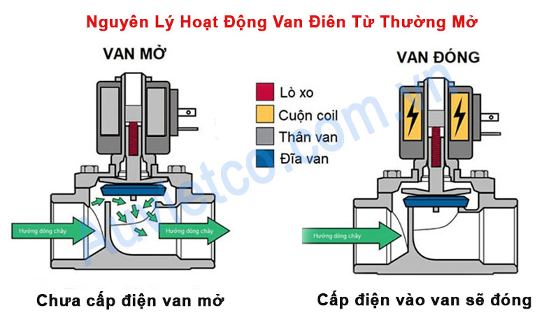 Ở trạng thái ban đầu van luôn mở cho lưu chất có thể lưu thông qua, trạng thái này được duy trì nhờ lò xo. Khi cấp điện cho van thì cuộn coil điện sẽ sinh ra từ trường, lực từ trường này lớn hơn lực của lò xo nên sẽ làm Piston đóng lại và ngăn không cho lưu chất đi qua
