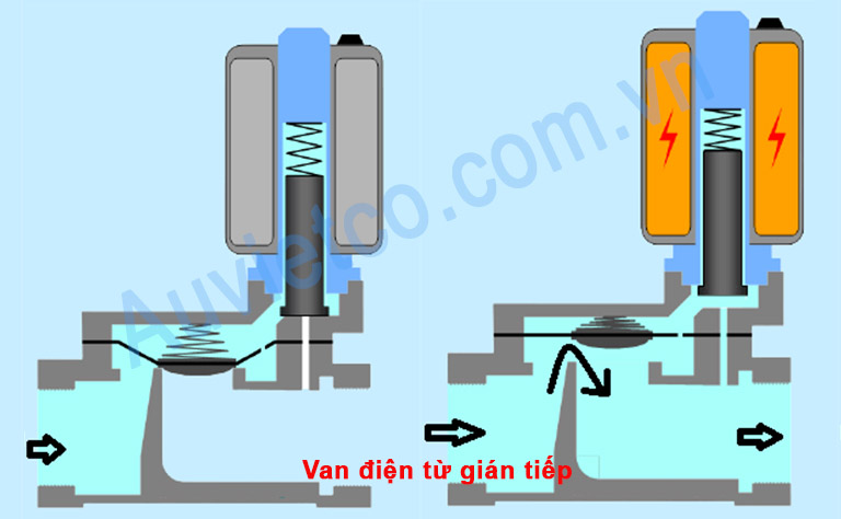 Van điện từ gián tiếp phù hợp với các hệ thống có kích cỡ lớn từ DN25 trở lên hay những hệ thống có áp suất lớn trên 16 bar.