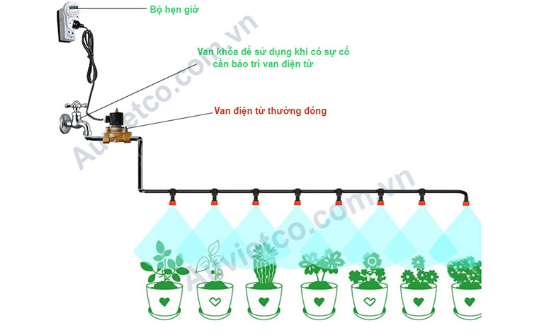 Van điện từ phun sương thường kết hợp với các bộ điều khiển tưới cây tự động, mỗi chiếc van điện từ sẽ có vai trò quản lý và điều khiển một khu vực tưới độc lập hay hoạt động đóng ngắt theo 1 chương trình tưới cụ thể đã cài đặt trước.