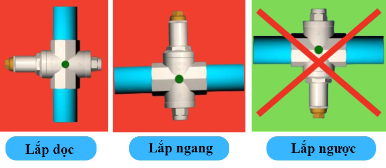 Bước 5: Xác định chiều lắp đặt đầu ra và đầu vào theo hướng mũi tên, tùy thuộc vào từng hệ thống bạn có thể lắp đặt theo nhiều chiều khác nhau như lắp ngang, dọc theo đường ống nhưng không được lắp lộn ngược. Quấn băng tan vào đầu ren để giúp van tránh được hiện tượng rò rỉ và bảo vệ đầu ren.